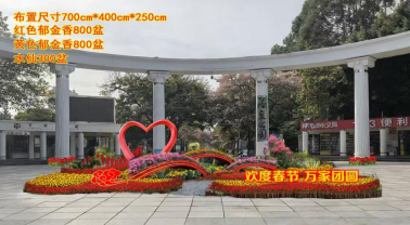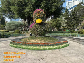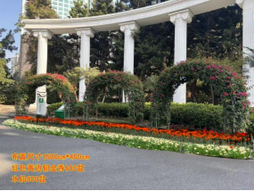 布置一(单独摆放):将组盆后的郁金香花卉成品,按照适宜的间距单独摆放在布置区域内,营造整齐有序、生机勃勃的景观氛围效果。这种布置方式适用于西大门入口处两侧、西大门通道两侧、西大门喷泉处、北大门通道、小黄鸭绿雕处、花瓶绿雕处。