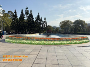布置二(组合造型):根据公园的主题和景观设计需求,将组盆后的郁金香花卉成品灵活组合,打造花球、花塔、花带等生动造型。该方式可显著增强景观的层次性与趣味性,有效吸引游客驻足。在组合过程中,需注重郁金香不同花色与花型的协调搭配,以提升整体造型的艺术效果。此布置方式适用于北大门入口处及宝瓶广场等人流汇集区域。